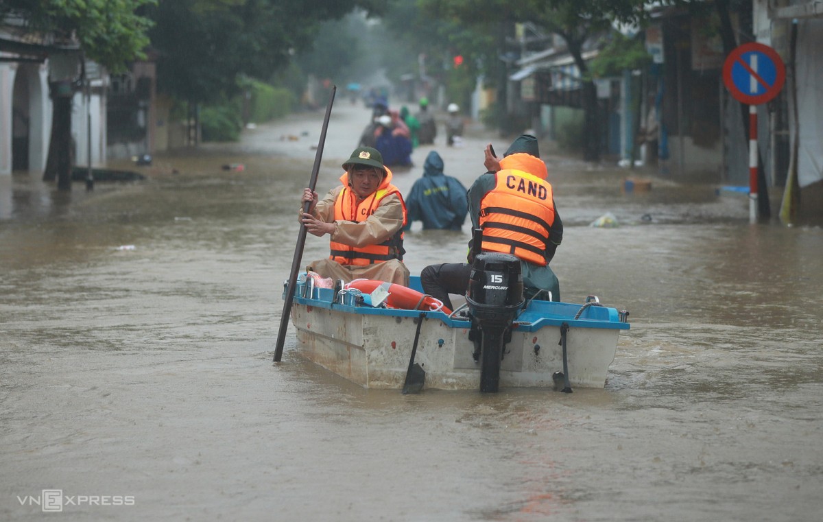 Đường Nguyễn Chí Thanh đoạn qua phường Thuận Hóa ngập sâu hơn 1m. Người dân muốn di chuyển phải đi thuyền hoặc lội nước.