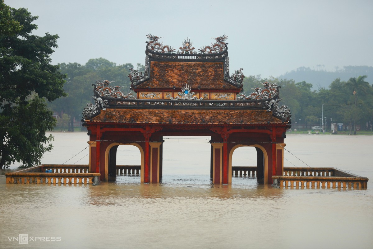 Nước lũ đang tràn vào kinh thành Huế gây ngập một số tuyến đường Mai Thúc Loan, Lê Thánh Tôn và đường dọc sông Ngự Hà. Các tuyến đường này cách đại nội Huế hơn 100 m.