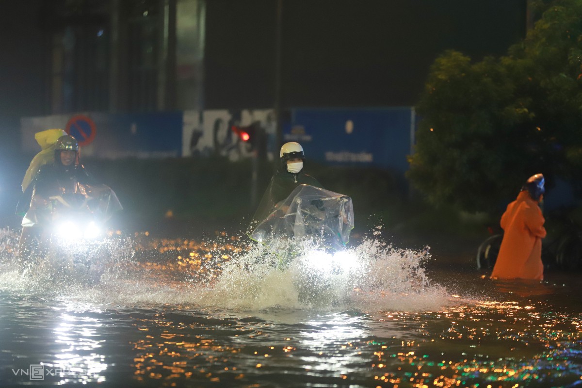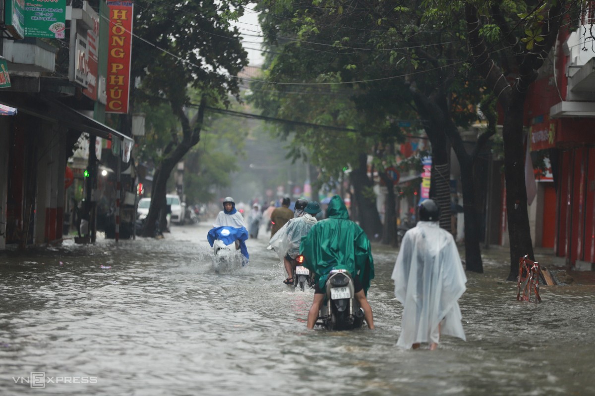 Các tuyến đường Bà Triệu, Trường Chinh ở phường Thuận Hóa ngập 0,3-0,5 m, giao thông đi lại khó khăn.