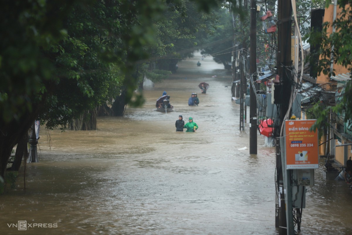 Tuyến đường Bạch Đằng, Huỳnh Thúc Kháng dọc sông Đông Ba có đoạn ngập cao tới ngực, người dân cố tìm cách lội qua vùng ngập.