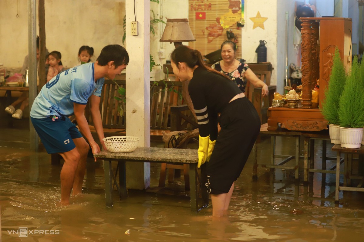 Nước lũ tràn vào nhà dân trong đêm, người dân phường Thuận Hóa phải khẩn trương kê dọn đồ đạc lên cao.