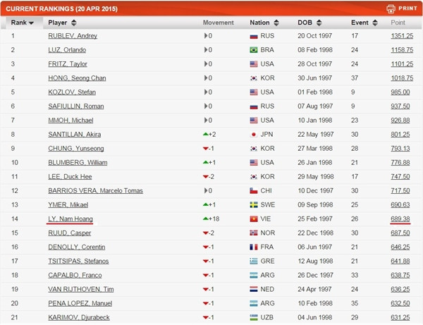 Trong bảng xếp hạng mới nhất của Liên đoàn quần vợt thế giới (ITF), tay vợt 18 tuổi Lý Hoàng Nam đã vươn lên đứng thứ 14 trẻ thế giới với 689.38 điểm.