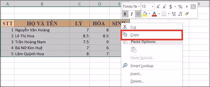 Bước 1: Chọn dữ liệu trên Excel mà bạn muốn copy sang Word > Nhấn chuột phải > Chọn Copy (Hoặc nhấn Ctrl + C).