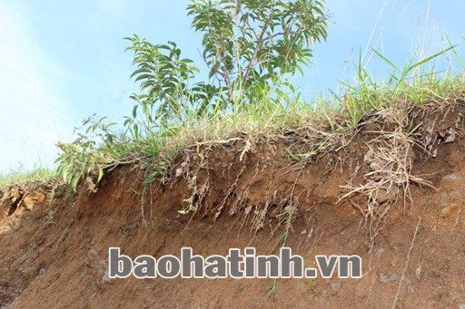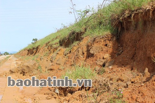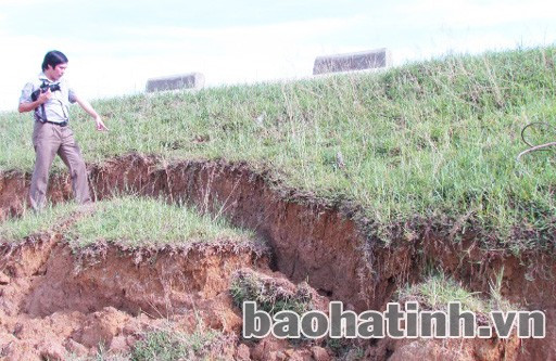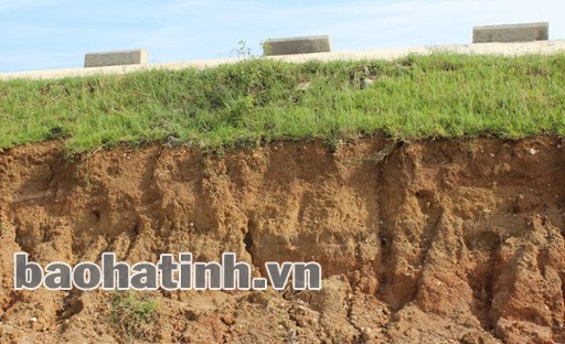 Điều đáng ngại hơn là tại đoạn qua phường Trung Lương (thị xã Hồng Lĩnh), mái phía đồng (phía trong đê) suốt chiều dài khoảng 1 km, do đơn vị thi công đào chân đê để xây tường kè nhưng thi công dở dang rồi bỏ vậy nên sau trận mưa mới đây, mái đê đoạn này bị sạt lở nghiêm trọng.