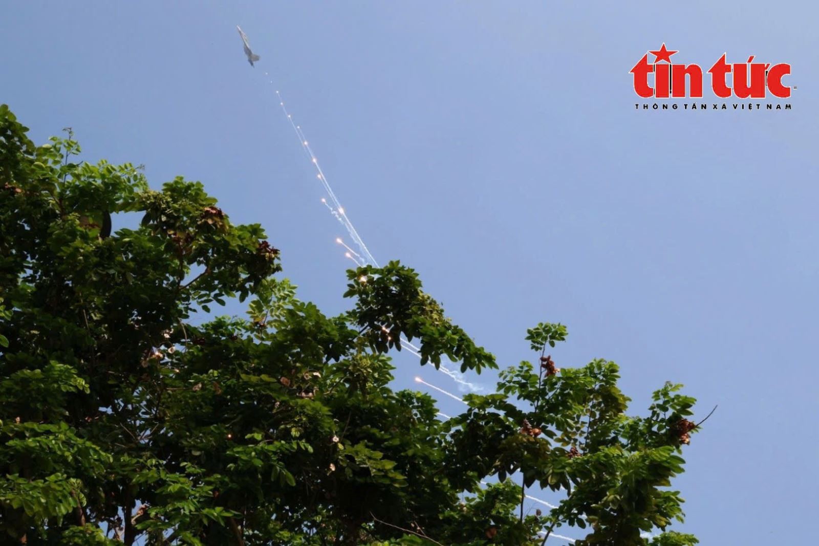 Những chiếc máy bay Su-30MK2 - hổ mang chúa thực hiện các màn lộn trên không trung khá bắt mắt. Màn trình diễn của máy bay tiêm kích nhìn từ xa. Ảnh: Thu Ngân