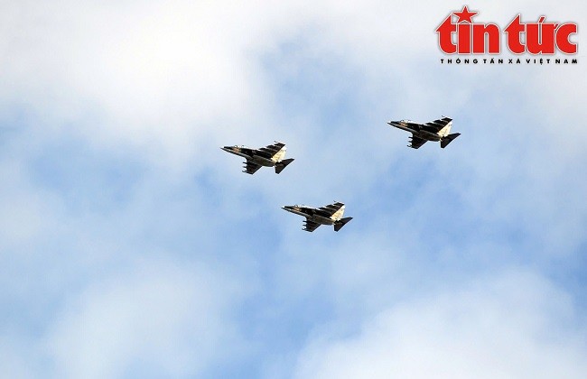 Đội hình bay sáng nay bao gồm các máy bay tiêm kích như Yak130 và Su-30MK2 cùng với nhiều trực thăng Mi-17 và Mi-8 chia thành các tốp bay theo đội hình chiến thuật.