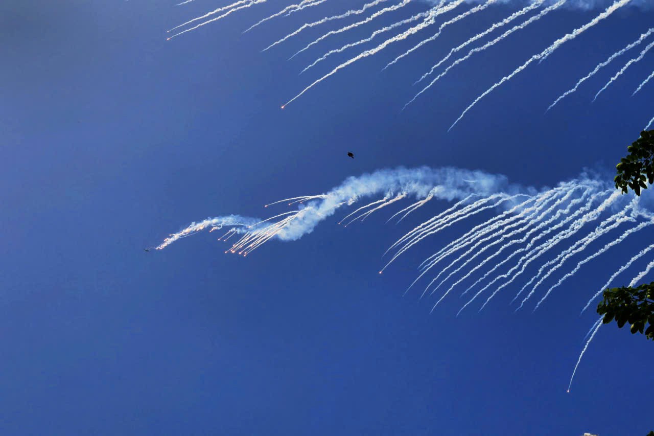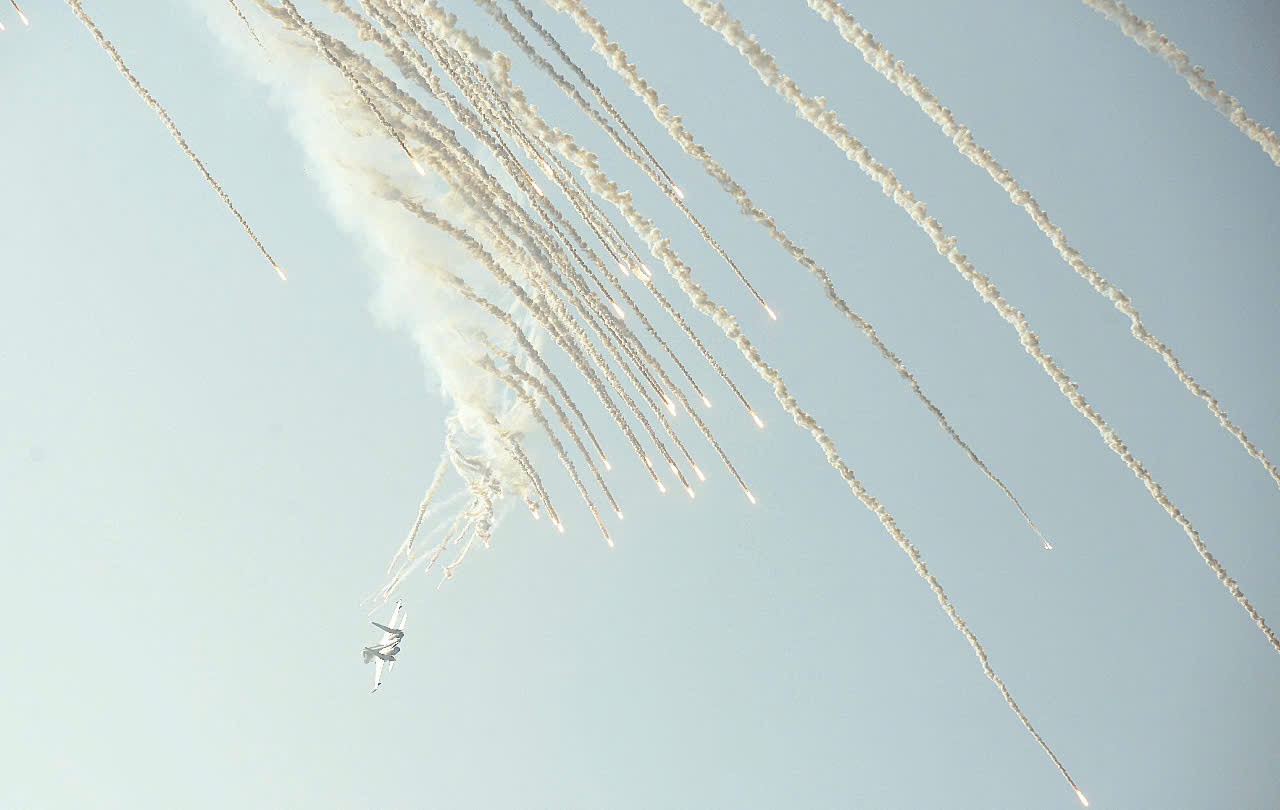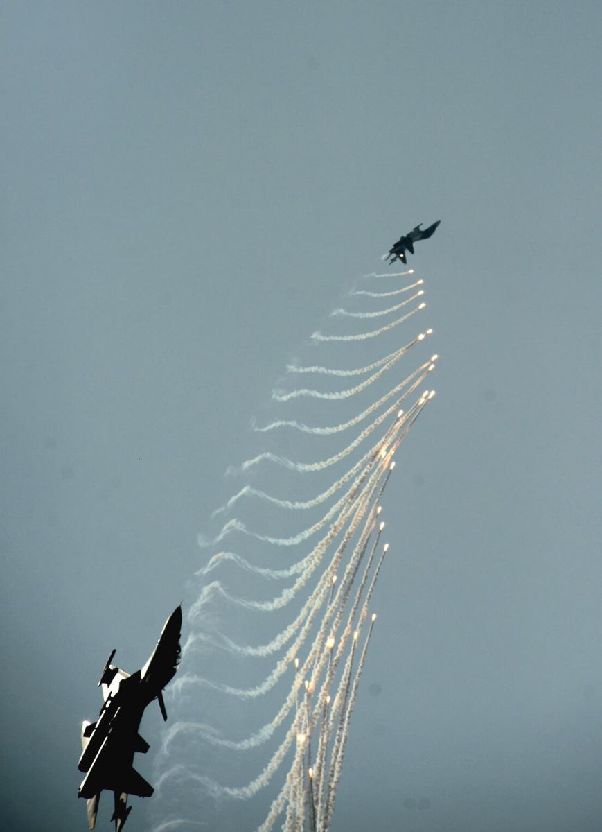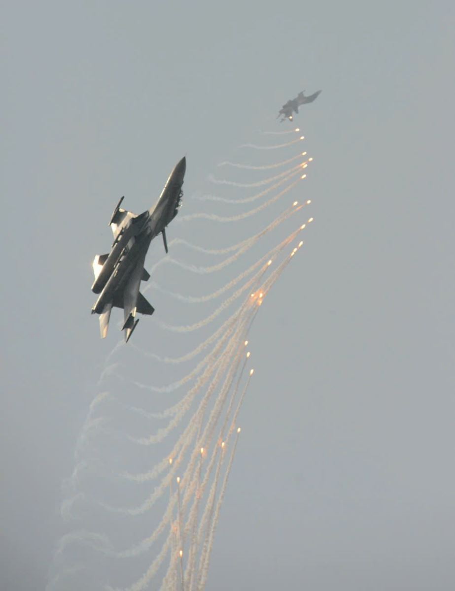 Màn thả bẫy nhiệt của Su-30MK2 để lại một vệt trắng trên nền trời.
