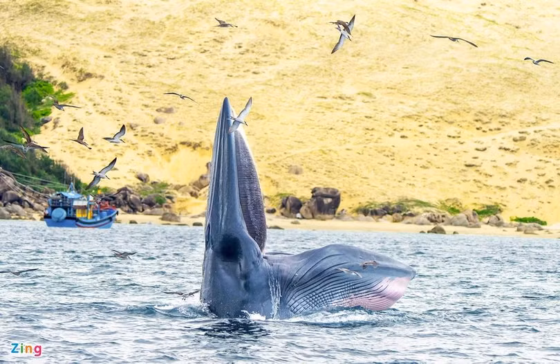 Khoảnh khắc cá voi mẹ leo lên mặt biển há miệng đớp mồi kỳ thú gần sát với cồn cát Đề Gi. Thống kê của xã Cát Khánh (huyện Phù Cát), những ngày qua, hàng trăm du khách, nghệ sĩ nhiếp ảnh, nhà báo và các nhà khoa học đã về đây thuê ghe ra vùng biển gần bờ thưởng ngoạn, khảo sát nghiên cứu, săn ảnh cá voi.