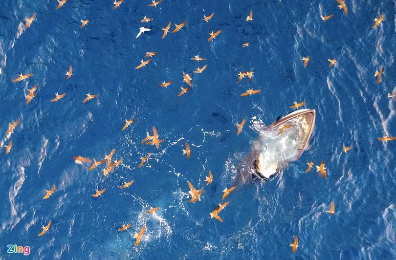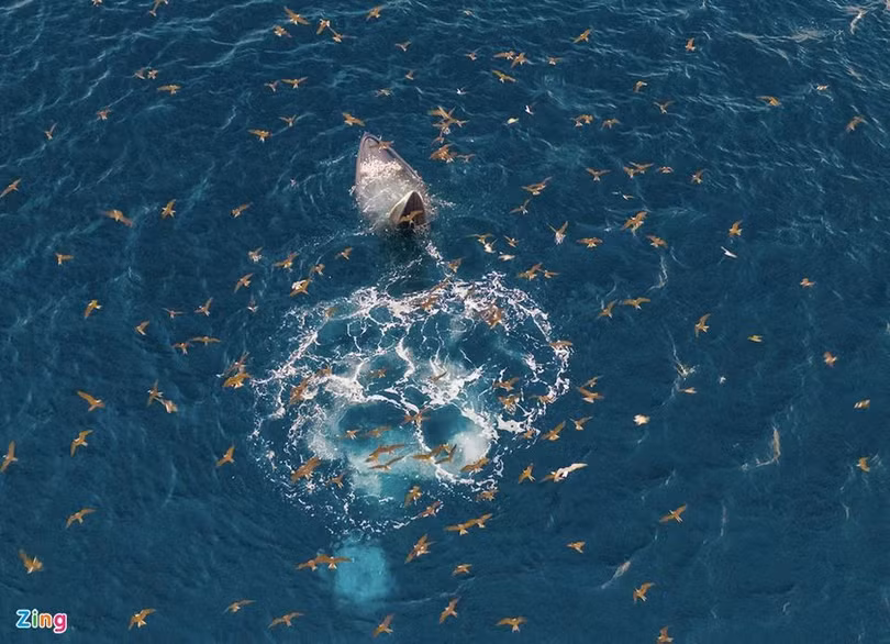 Đàn hải âu từ trên trời cao tập trung sà xuống, kết thành vòng tròn bay lượn xung quanh khu vực cá voi há miệng săn mồi trên mặt biển, tạo nên bức tranh thiên nhiên tuyệt tác.