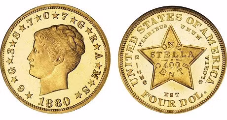 Đồng xu này có tên gọi là đồng Stella chỉ được đúc trong một khoảng thời gian rất ngắn, từ 1879-1880, khi đó Mỹ thử gia nhập thị trường tiền tệ Latinh. Đồng tiền xu này khi đó cũng được sản xuất để người Mỹ có thể giao dịch “ngang thưng” tại các nước Châu Âu. Một đồng xu Stella có giá trị tương đương với một đồng xu 20 franc Pháp.