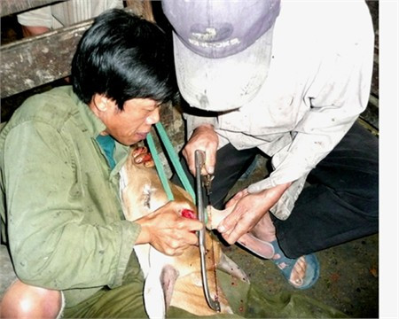 Chỉ một loáng cặp nhung được cắt xong. Từ chỗ cắt sát đầu, huyết tươi phun thành tia được hứng vào một cái chậu nhôm chứa rượu đặt sẵn. Đây là thứ huyết pha rượu dành cho thợ cắt nhung, khách đến mua và gia chủ thưởng thức. Nếu là thượng khách hay ông già, bà lão trong gia đình đau yếu mới có thể được ghé miệng vào chỗ cắt để thưởng thức sự tinh tuý của huyết nhung. Chỗ cắt được dịt lá cây cỏ lào (có nơi gọi là hoàng xà) hoặc cây chó đẻ, sấy khô, tán bột rắc lên, sau đó cũng loại lá này, vò nhỏ rịt bên ngoài rồi dùng vải màn bọc vào và quấn chặt bằng rơm
