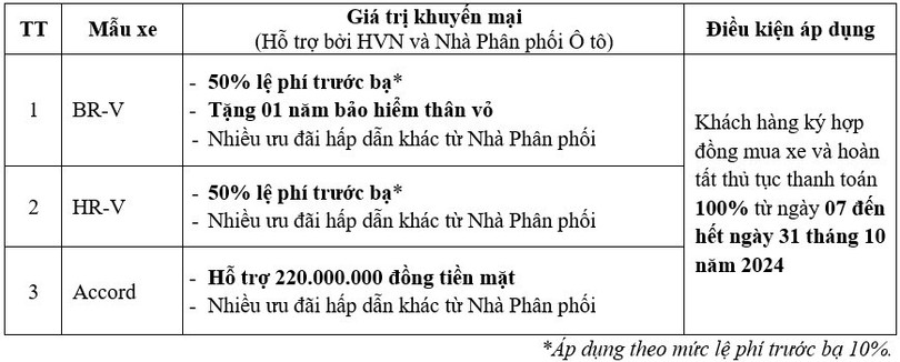 Nhằm kích cầu mua sắm cũng như mang đến cho khách hàng cơ hội dễ dàng sở hữu những mẫu xe ô tô Honda, Honda Việt Nam (HVN) phối hợp cùng hệ thống nhà phân phối triển khai chương trình khuyến mại hấp dẫn từ ngày 7-31/10/2024 cho các dòng xe: Honda BR-V, Honda HR-V, Honda Accord...