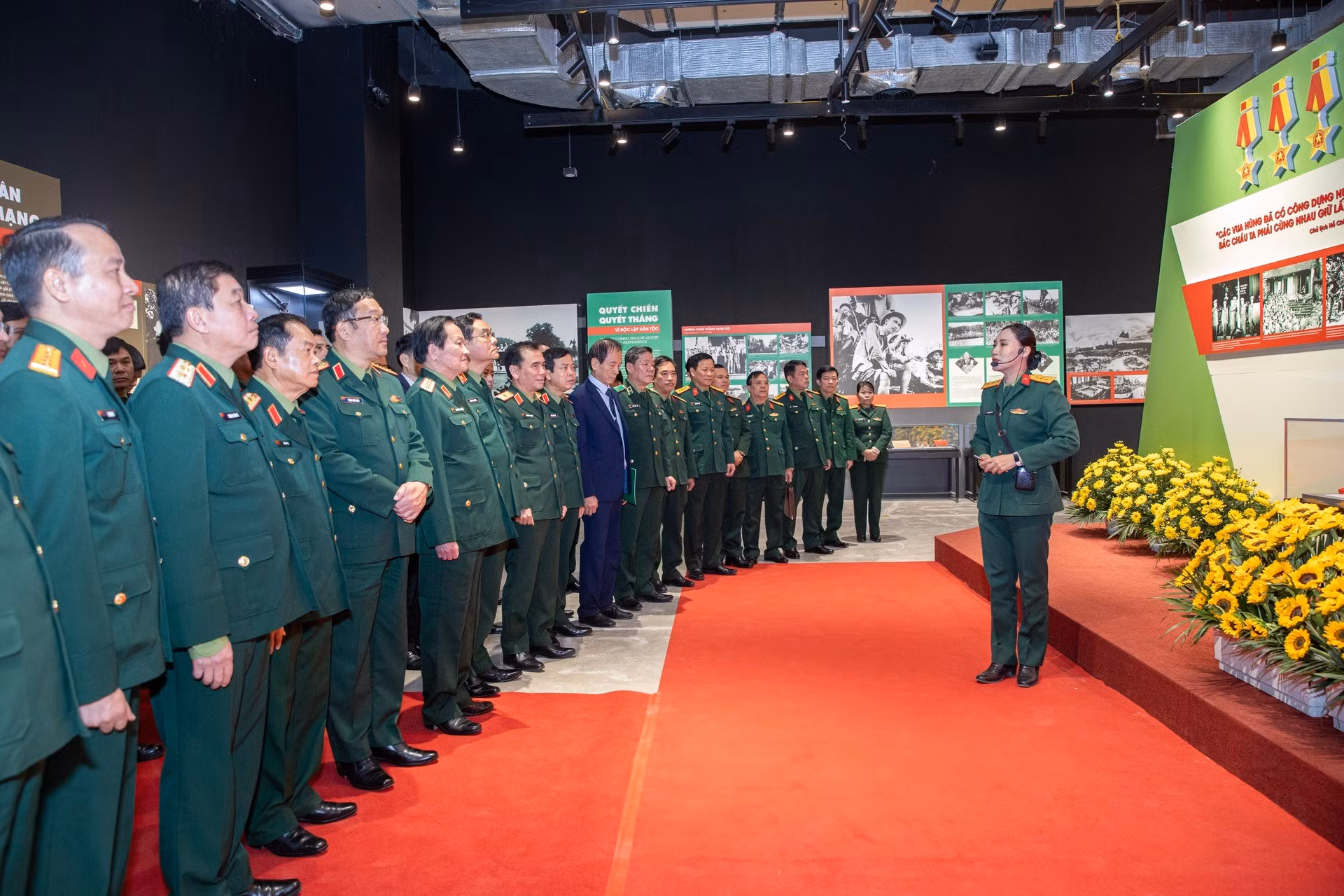 Thượng tướng Phạm Hoài Nam (thứ 4 từ trái sang phải), Thứ trưởng Bộ Quốc phòng cùng nhiều đại biểu nghe giới thiệu về không gian trưng bày tại triển lãm.