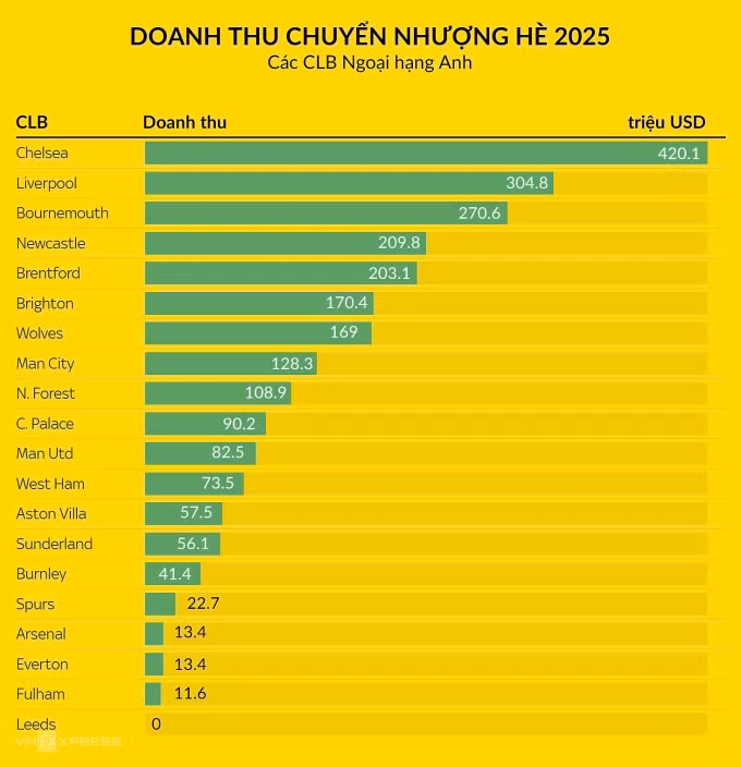 Ở chiều ngược lại, đội mới thăng hạng Leeds United là CLB duy nhất không thu được bất kỳ khoản tiền nào từ việc bán cầu thủ.