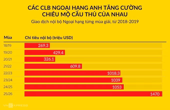 Cách đây sáu mùa, các thương vụ nội địa kiểu này còn khá hiếm. Tuy nhiên, hè này, số tiền chi cho các bản hợp đồng nội địa Ngoại hạng đã lên tới 1,47 tỷ USD, tăng từ 1,05 tỷ USD của năm ngoái. Xu hướng này dự kiến còn tiếp tục khi các CLB ưu tiên những bản hợp đồng sẵn có ở giải đấu.