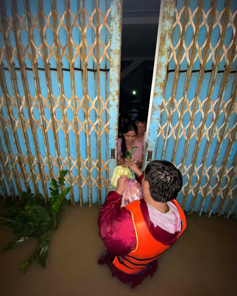 Lực lượng cứu trợ vào những nơi ngập sâu để tiếp tế lương thực cho người dân phường Quy Nhơn Đông, tối 19/11. Ảnh: Nguyễn Quan