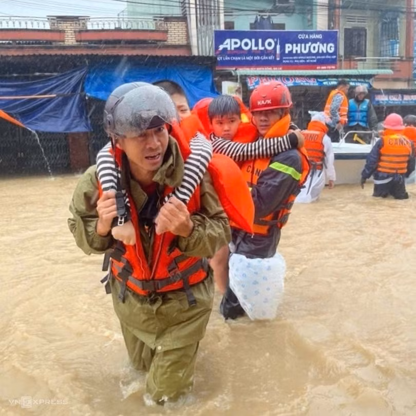 Các em nhỏ được lực lượng cứu hộ cõng sau khi đưa ra từ điểm cô lập.Theo UBND Gia Lai, các phường Quy Nhơn Bắc, Quy Nhơn Đông và các xã Tuy Phước, Tuy Phước Đông, Tuy Phước Bắc... đang ngập sâu do mưa lũ. Toàn tỉnh có hơn 8.300 hộ với gần 36.000 người bị ngập và cô lập; một số tuyến đường hư hỏng.