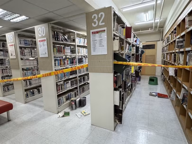 Sách rơi khỏi kệ trong thư viện Vĩnh Xuân ở thành phố Đài Bắc.