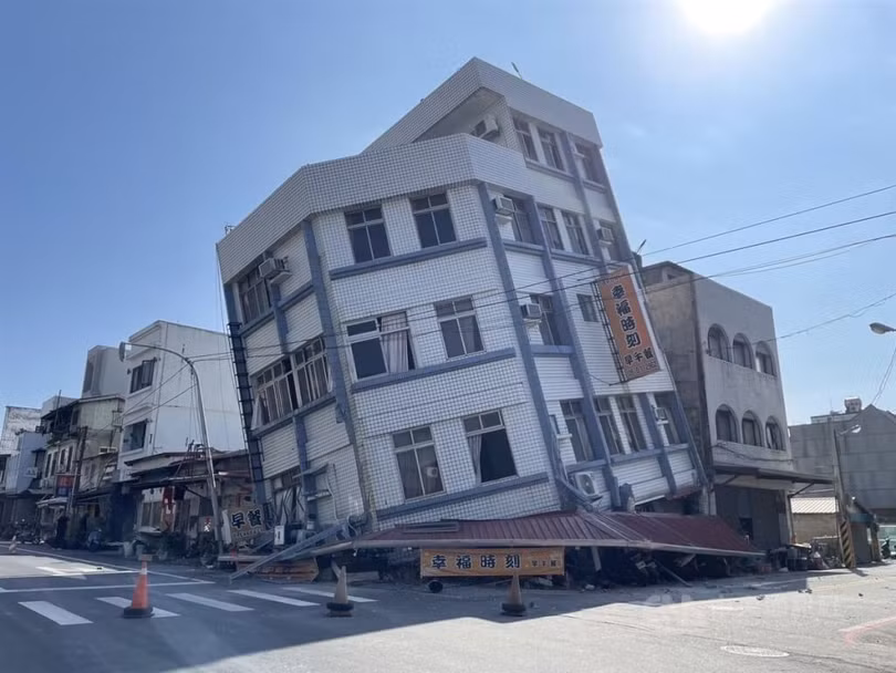 Tòa nhà nằm ở góc đường Trung Sơn và Trùng Khánh tại huyện Hoa Liên đổ nghiêng sau trận động đất. Lực lượng cứu hộ đang nỗ lực đưa người mắc kẹt ra ngoài.