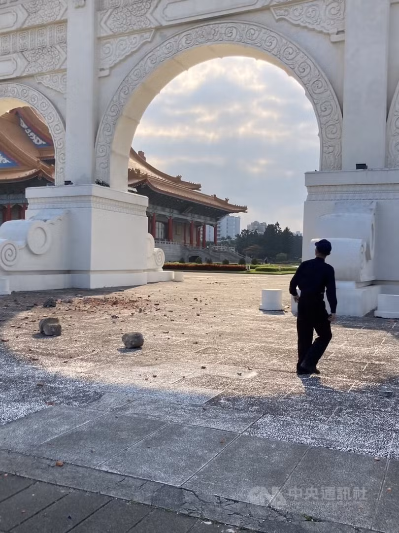 Gạch rơi vỡ tại đài tưởng niệm Tưởng Giới Thạch ở quận Trung Chính, thành phố Đài Bắc.
