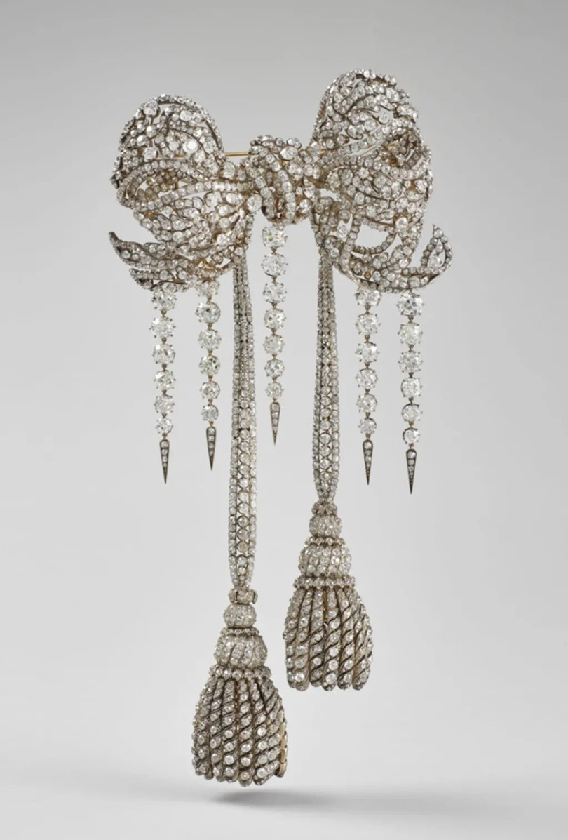 Trâm cài áo hình chiếc nơ và hai tua rua kim cương dài cùng 5 tua rua kim cương ngắn hơn, được nạm 2.438 viên kim cương nhỏ và 196 viên lớn cắt kiểu hoa hồng.