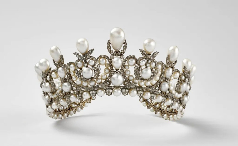 Mũ miện ngọc trai là món quà cưới của Vua Napoleon III tặng cô dâu là Hoàng hậu Eugénie năm 1853, đính 212 viên ngọc trai và 1.998 viên kim cương cùng 992 viên kim cương cắt kiểu hoa hồng.