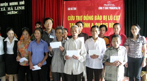 Cùng ngày, Văn phòng Bảo hiểm Nhân thọ Prudential tại Nghệ An phối hợp với Báo Hà Tĩnh đã đến động viên, thăm hỏi và ủng hộ 20 triệu đồng cho 20 gia đình bị thiệt hại trong đợt lũ lụt vừa qua tại các xã Hà Linh (Hương Khê) và Đức Bồng (Vũ Quang).