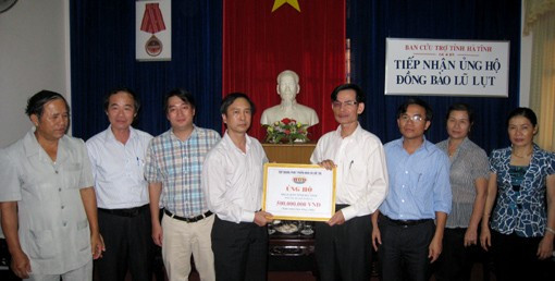 Ngày 9-10, đại diện Công ty Đầu tư phát triển nhà và đô thị 1 (thuộc Tập đoàn Đầu tư phát triển nhà và đô thị) phối hợp với Quỹ trái tim nhân ái (Báo Hà Nội mới) và Báo Hà Tĩnh đã đến Ban cứu trợ tỉnh Hà Tĩnh ủng hộ 500 triệu đồng nhằm chia sẻ những khó khăn, mất mát về người và tài sản với nhân dân các vùng bị lũ lụt tỉnh Hà Tĩnh.