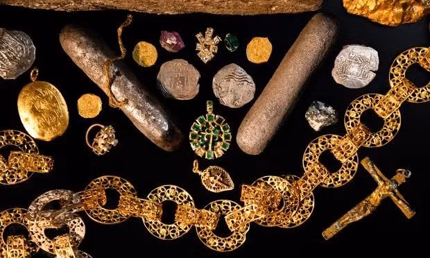 Vàng, đồ trang sức và tiền xu được đoàn thám hiểm tìm thấy. Ảnh: Guardian