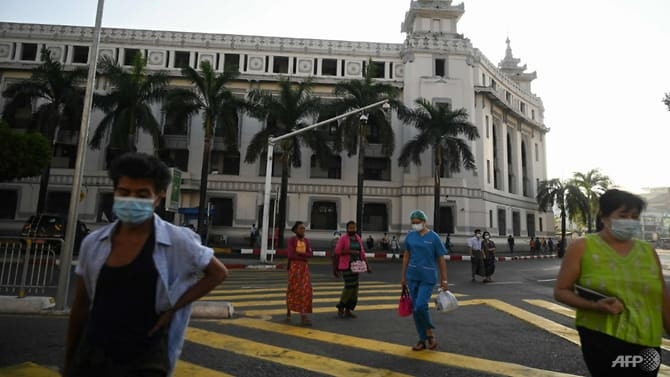 Người dân đi lại gần ngôi chùa Shwedagon ở Yangon ngày 1/2/2021, sau khi có thông báo quân đội Myanmar đã bắt giữ các lãnh đạo Chính phủ sáng cùng ngày. (Ảnh: AFP)