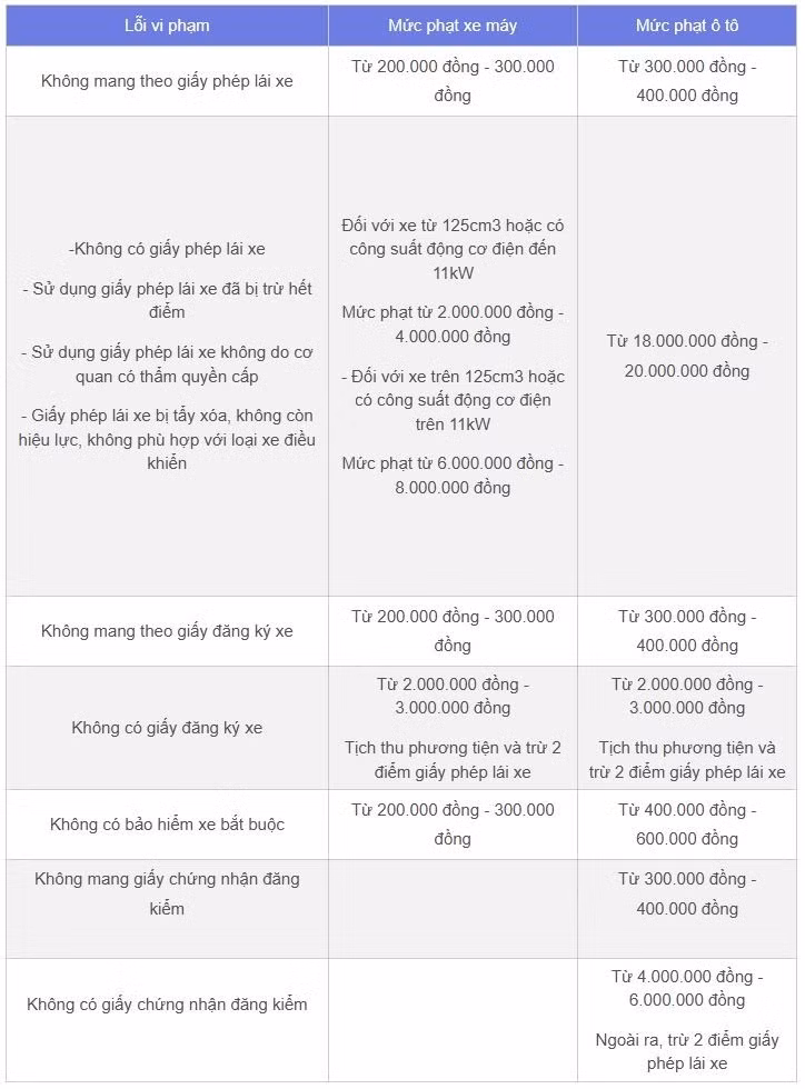 Như vậy, từ năm 2025, người tham gia giao thông không mang đủ giấy tờ xe có thể bị phạt từ 200.000 đồng đến 20.000.000 đồng tùy theo từng trường hợp vi phạm và từng loại phương tiện mà người tham gia giao thông điều khiển.