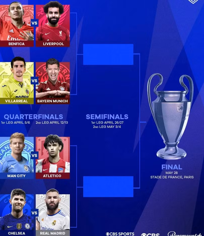 Lễ bốc thăm chia cặp tứ kết Champions League 2021/22 diễn ra lúc 18h tại trụ sở UEFA ở Nyon (Thụy Sĩ).