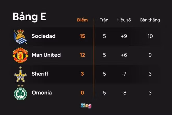 MU thắng đậm, nhưng vẫn đứng thứ 2 ở bảng E, do ở trận cùng giờ, Real Sociedad thắng Omonia 2-0. “Quỷ đỏ” cần đánh bại đối thủ La Liga với cách biệt nhiều hơn một bàn ở lượt trận cuối mới có thể chiếm ngôi đầu, đồng nghĩa với vé vào thẳng vòng 16 đội Europa League. Đội đứng thứ 2 sẽ phải chơi trận play-off với một CLB rớt xuống từ vòng bảng Champions League.