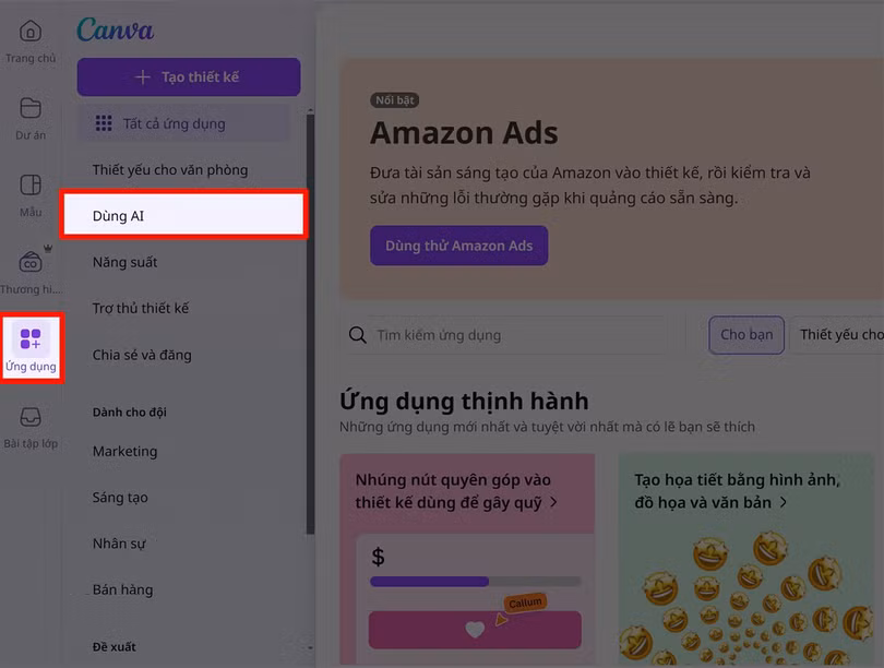 Bước 1:Mở Canva trên máy tính của bạn lên > Nhấn chọn vào mục Ứng dụng > Chọn vào mục Dùng AI để tiến hành sử dụng Canva AI nha.