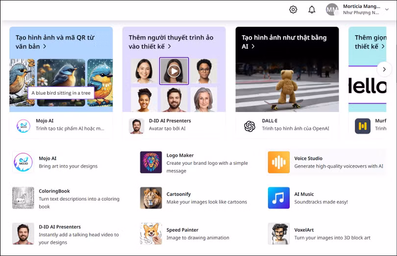 Bước 2: Tại đây bạn sẽ thấy rất nhiều ứng dụng AI hỗ trợ bạn trong quá trình thiết kế.
