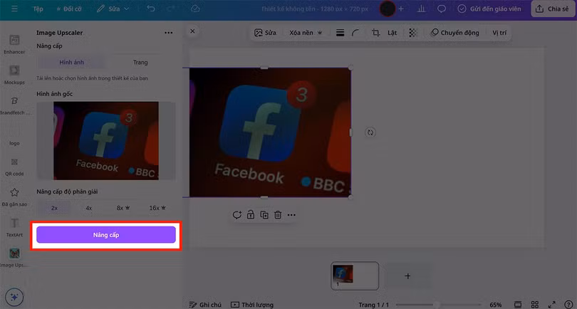 Bạn chỉ cần Tải ảnh cần làm rõ lên Canva > Nhấn chọn vào mục Nâng cấp, ngay lập tức Canva AI sẽ xử lý chp bạn tấm ảnh này.