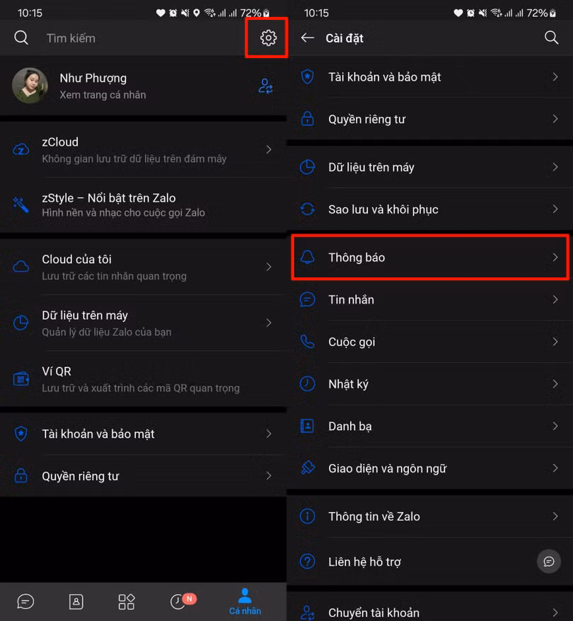Hãy mở ứng dụng Zalo lên > Nhấn chọn vào mục Cài đặt > Chọn tiếp đến mục Thông báo.
