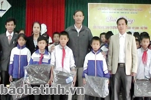 * Cũng trong sáng nay, Hội Đồng hương Nghệ - Tĩnh tại Nhật Bản đã trao 70 suất quà (mỗi suất là 1 chiếc cặp) cho các em học sinh giỏi, học sinh nghèo vượt khó ở Trường THCS Kỳ Xuân (Kỳ Anh).
