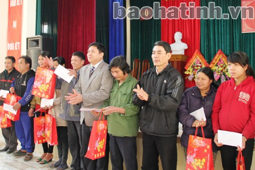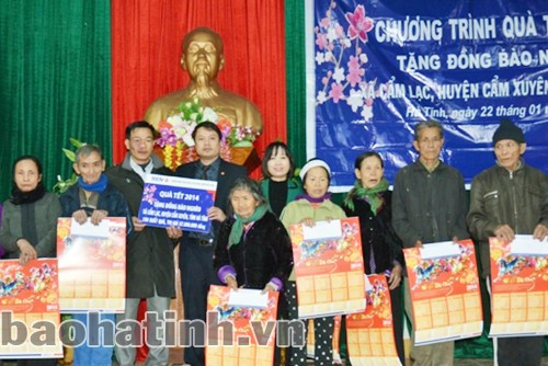 * Chi nhánh Ngân hàng Đầu tư và Phát triển Hà Tĩnh (BIDV Hà Tĩnh) vừa đến thăm hỏi, tặng quà cho các hộ nghèo và gia đình chính sách xã Cẩm Lạc (Cẩm Xuyên) nhân dịp tết Giáp Ngọ 2014.
