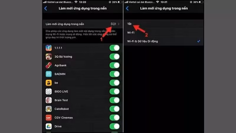 Bước 2: Bạn chạm vào mục Làm mới ứng dụng trong nền, sau đó nhấn vào tùy chọn Tắt để dừng các ứng dụng chạy ngầm.
