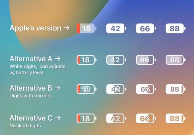 Tuy vậy, một số người dùng không đồng ý với cách tiếp cận này. Trong khi đó, số khác lại đưa ra một vài gợi ý thiết kế cho Apple, đảm bảo số phần trăm vẫn dễ nhìn ngay cả khi thanh pin rút dần theo thời lượng thực tế.
