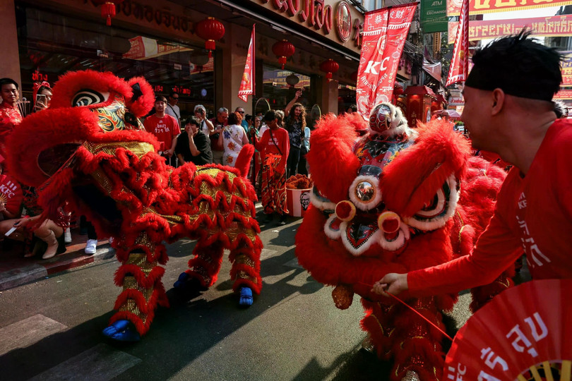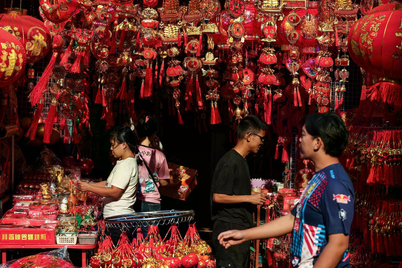 Cảnh tượng trước thềm năm mới ở khu phố Chinatown tại Bangkok, Thái Lan.Một người bán vàng sắp xếp vòng tay vàng tại cửa hàng vàng trước Tết Nguyên đán tại khu phố Chinatown của Bangkok, Thái Lan.Du khách đến thăm triển lãm hoa mùa xuân được tổ chức tại Flower Dome ở Gardens by the Bay, Singapore. Chương trình diễn ra từ ngày 17/1 đến ngày 23/2 để kỷ niệm Tết Nguyên đán. Nổi bật giữa khung cảnh hoa nở rộ là tác phẩm hoa cao 4,5 m. Ảnh: Straits Times.Những chiếc đèn lồng trang trí chào đón năm Ất Tỵ trên các con phố ở Phố Chinatown, Singapore. Ảnh: Straits Times.Các thợ lặn biểu diễn múa lân sư rồng tại thủy cung SEA LIFE Bangkok Ocean World để chào mừng năm mới 2025. Ảnh: Tân Hoa xã.Buổi biểu diễn để chào mừng Tết Nguyên đán ở Phnom Penh, Campuchia. Ảnh: Tân Hoa xã.Chợ Glodok ở khu phố Chinatown tại Jakarta, Indonesia, rực rỡ trong sắc đỏ. Ảnh: Tân Hoa xã.