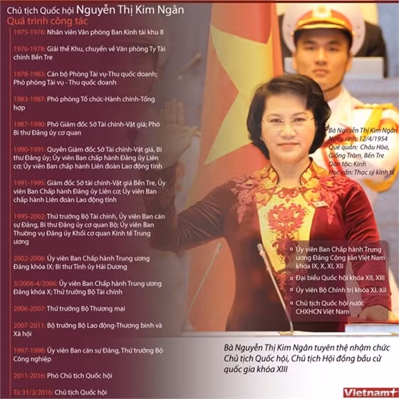 Sáng 31/3, tại kỳ họp thứ 11, Quốc hội khóa XIII, bà Nguyễn Thị Kim Ngân đã được tín nhiệm bầu chức vụ Chủ tịch Quốc hội khóa XIII, Chủ tịch Hội đồng Bầu cử quốc gia. TTXVN trân trọng giới thiệu tiểu sử của Chủ tịch Quốc hội Nguyễn Thị Kim Ngân.