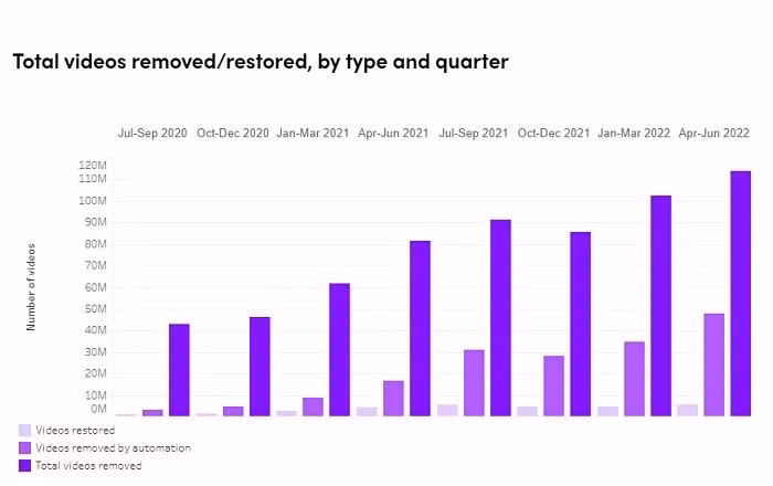 Cũng trong quý II, 48 triệu video đã bị hệ thống tự động của TikTok gỡ bỏ, tăng cao so với các quý trước. Nhưng đa số nội dung bị gỡ là vì người dùng báo cáo lên nền tảng, chiếm 96%. TikTok cho biết hãng đã kết hợp các công cụ tự động và đánh giá của người dùng để nhận diện những nội dung vi phạm quy định.