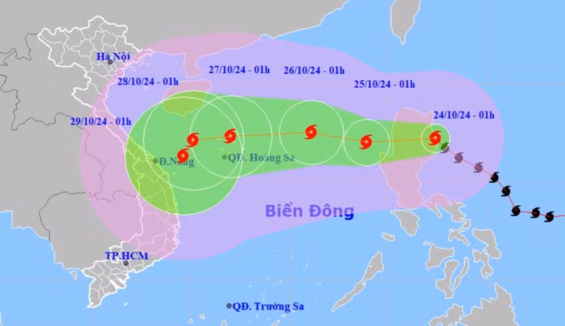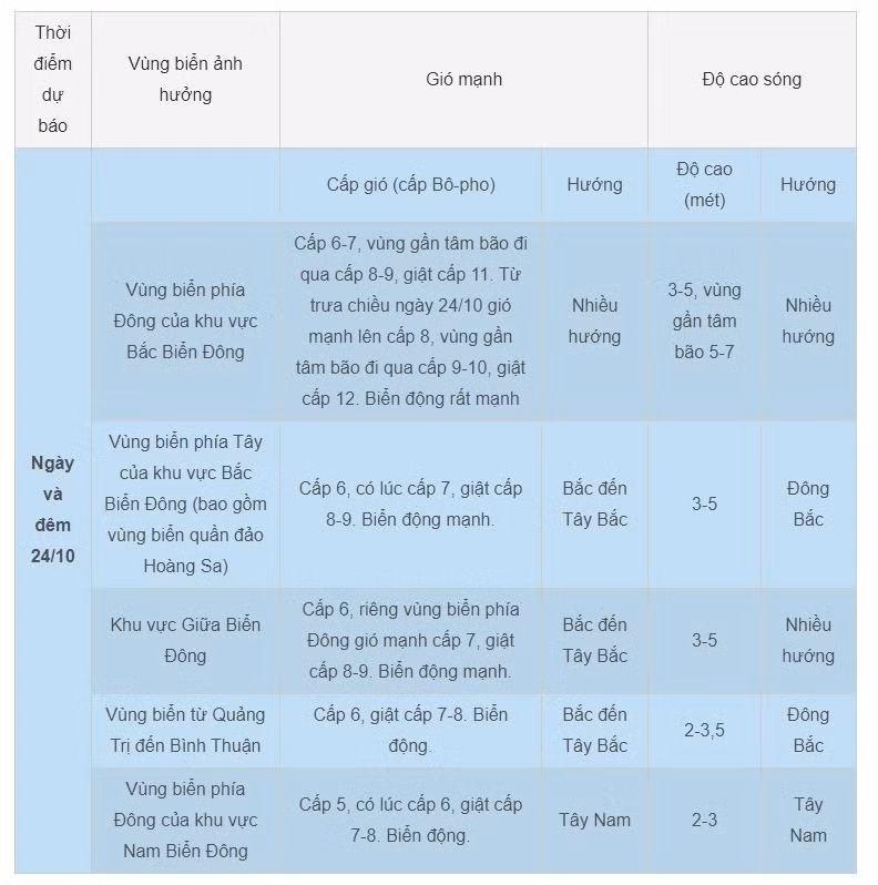 Ngoài ra, ngày và đêm 24/10, ở vùng biển phía Đông của khu vực Bắc Biển Đông có mưa bão, khu vực Giữa và Nam Biển Đông (bao gồm vùng biển quần đảo Trường Sa), vùng biển từ Bình Thuận đến Cà Mau, Cà Mau đến Kiên Giang và vịnh Thái Lan có mưa rào và giông rải rác. Trong mưa giông có khả năng xảy ra lốc xoáy và gió giật mạnh cấp 7-8.
