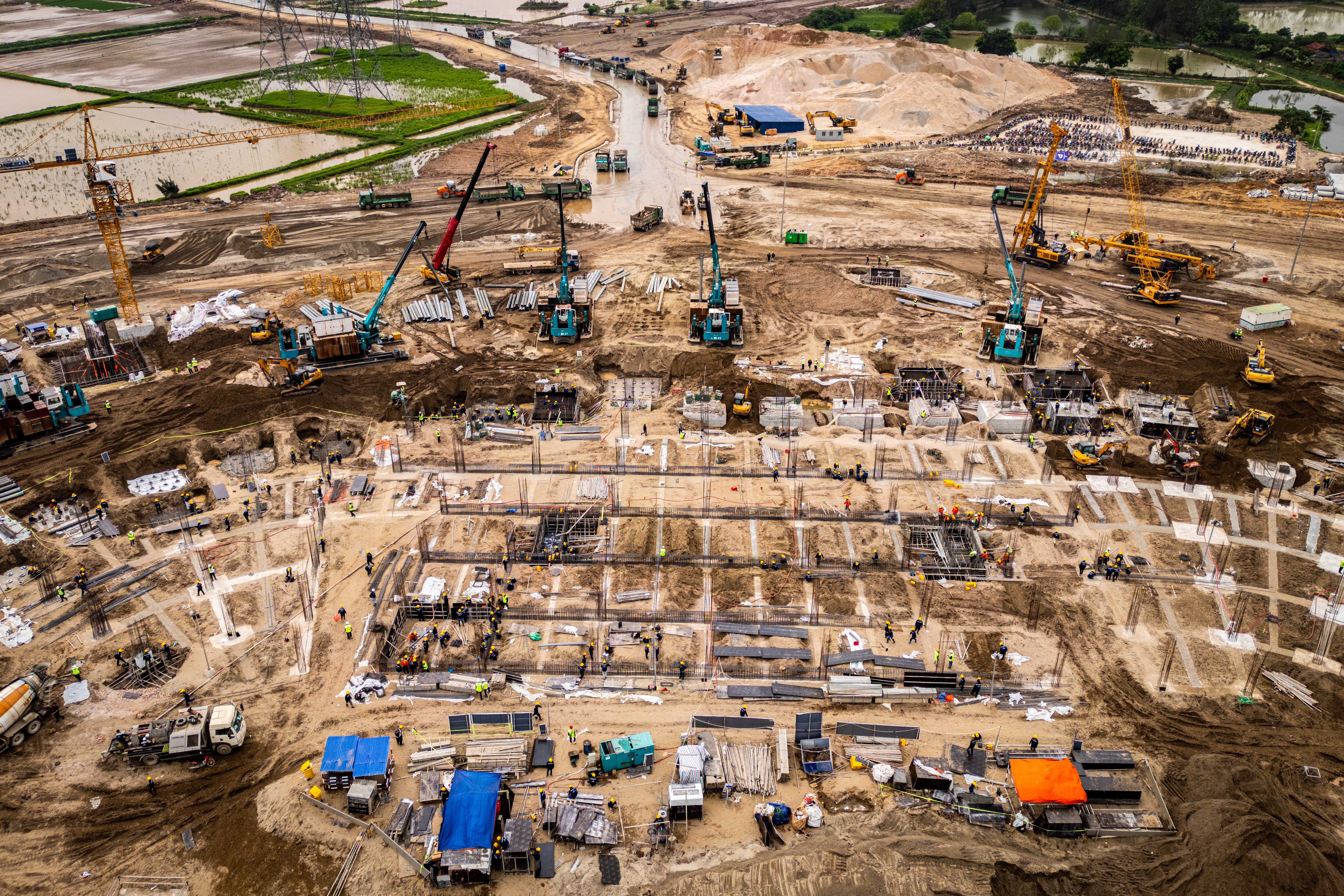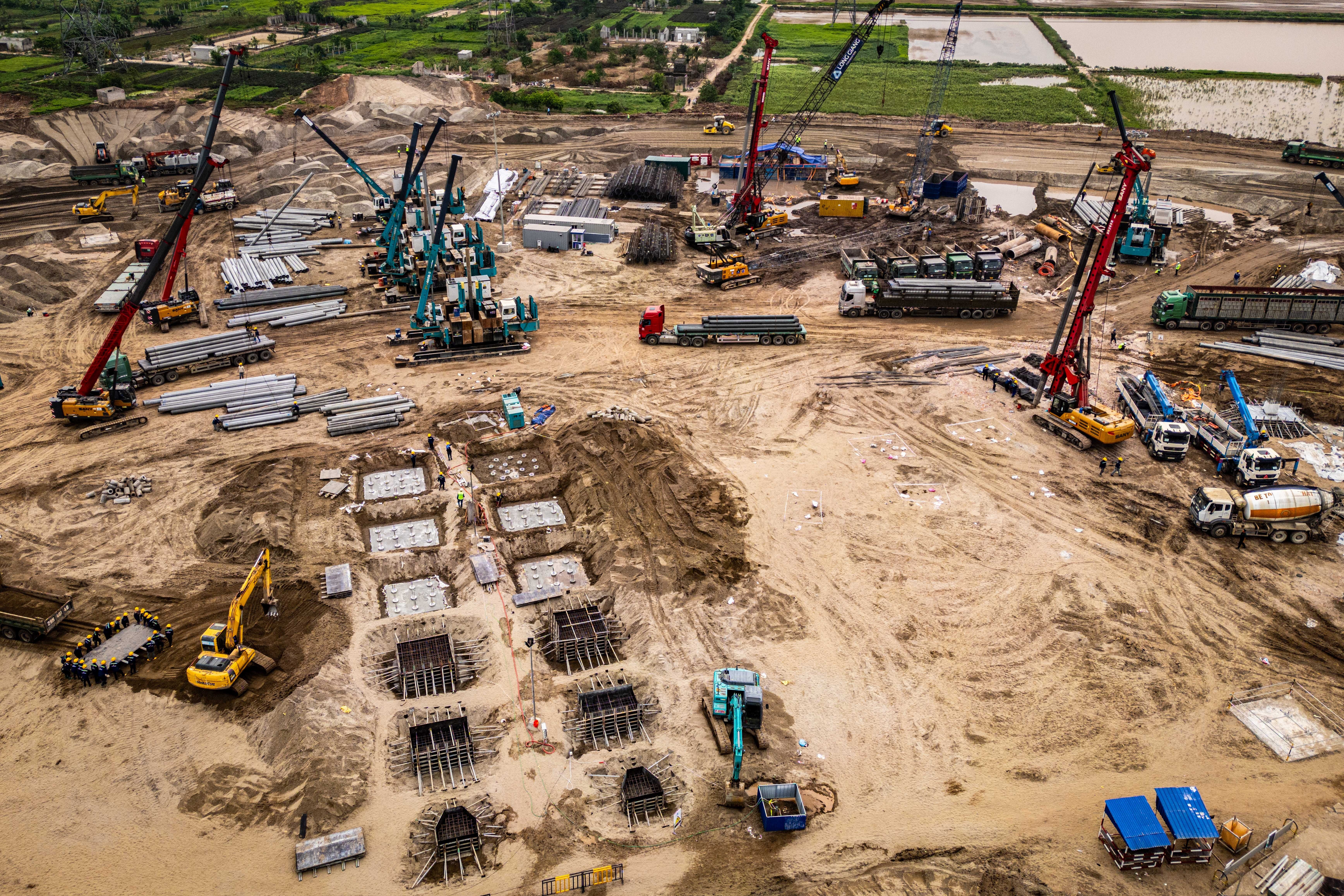 Trên công trường rộng hàng chục hecta, các cụm móng và cọc bê tông bắt đầu lộ diện. Hàng trăm công nhân được huy động thi công theo nhiều mũi, duy trì tiến độ liên tục ngay từ giai đoạn đầu dự án. Máy xúc, máy ủi hoạt động hết công suất để đào đất và hạ cốt nền, san phẳng mặt bằng.Tại nhiều khu vực, xe tải cỡ lớn tấp nập ra vào vận chuyển đất, đá phục vụ công trình. Phần lớn diện tích dự án trước đây là khu vực đất nông nghiệp của người dân lân cận, chủ yếu được trồng các loại hoa màu, cây ngắn ngày.