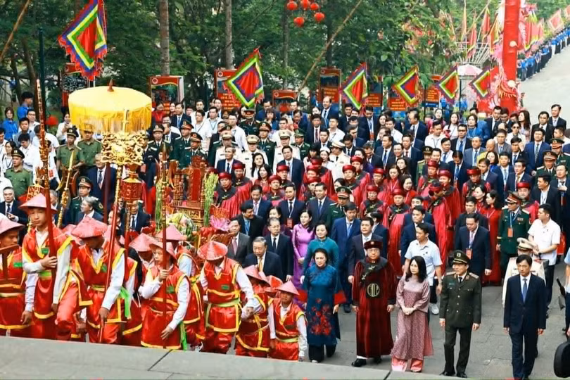 Trong không khí trang nghiêm, Tổng Bí thư, Chủ tịch nước Tô Lâm cùng đoàn đại biểu lãnh đạo Ðảng, Nhà nước, các cơ quan Trung ương, địa phương đã tề tựu đông đủ trước sân hành lễ tại khu vực Trung tâm Lễ hội Đền Hùng. Trong tiếng nhạc lễ hội linh thiêng, đoàn dâng hương với đội nghi trượng uy nghiêm, đoàn cờ phướn lộng lẫy, đội rước kiệu và lễ vật khởi hành từ sân Trung tâm Lễ hội qua Nghi môn, đền Hạ, đền Trung lên đền Thượng.