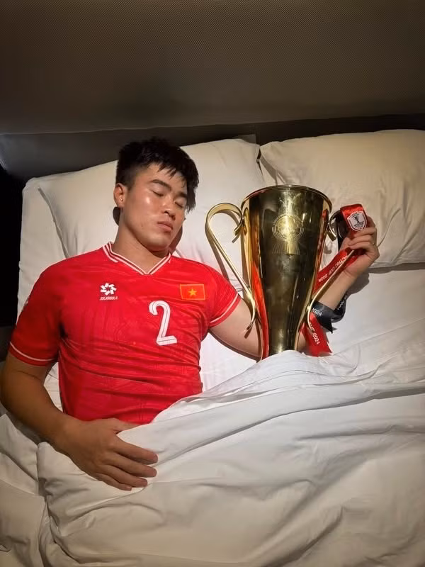 "Cuộc đời đã có lần thứ hai. Việt Nam quyết chiến quyết thắng", Nguyễn Tiến Linh đăng ảnh ôm cúp nằm ngủ cùng dòng chú thích. Tiền đạo sinh năm 1997 này đã có hai lần cùng Việt Nam vô địch ASEAN Cup trong các năm 2024 và 2018. Ở cả hai giải đấu, anh đều ghi bàn và để lại ấn tượng mạnh cho cổ động viên.Đỗ Duy Mạnh đăng nhiều bài viết để ăn mừng chiến thắng của đội nhà. Anh còn hài hước xin phép vợ con để được ngủ cùng chiếc cúp vô địch. Tại giải đấu năm nay, Duy Mạnh là người mang băng đội trưởng và anh được khen ngợi về tinh thần trách nhiệm cũng như sự quan tâm chu đáo dành cho các đồng đội.