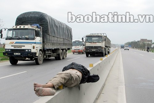 Một số người dân làm đồng gần đó cho biết: Vào khoảng 9h, người đàn ông này (chừng 50 tuổi) đi bộ với bộ dạng "chân nam đá chân chiêu". Sau khi đi đến đoạn đường trên thì leo lên dãy phân cách nằm ngủ.