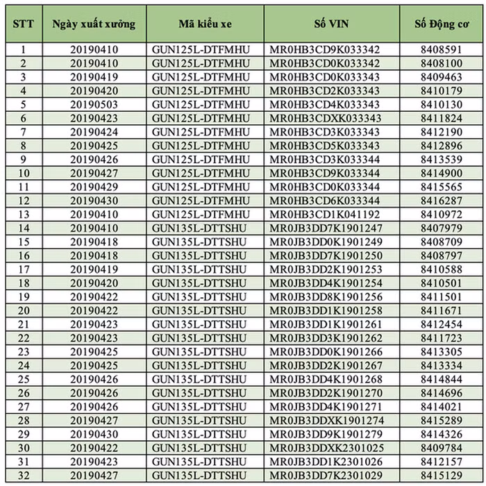 Theo đó, các mẫu xe Toyota Hilux nằm trong đợt triệu hồi có thời gian sản xuất từ ngày 10/4/2019 đến ngày 3/5/2019. Số lượng xe bị ảnh hưởng là 32 chiếc.